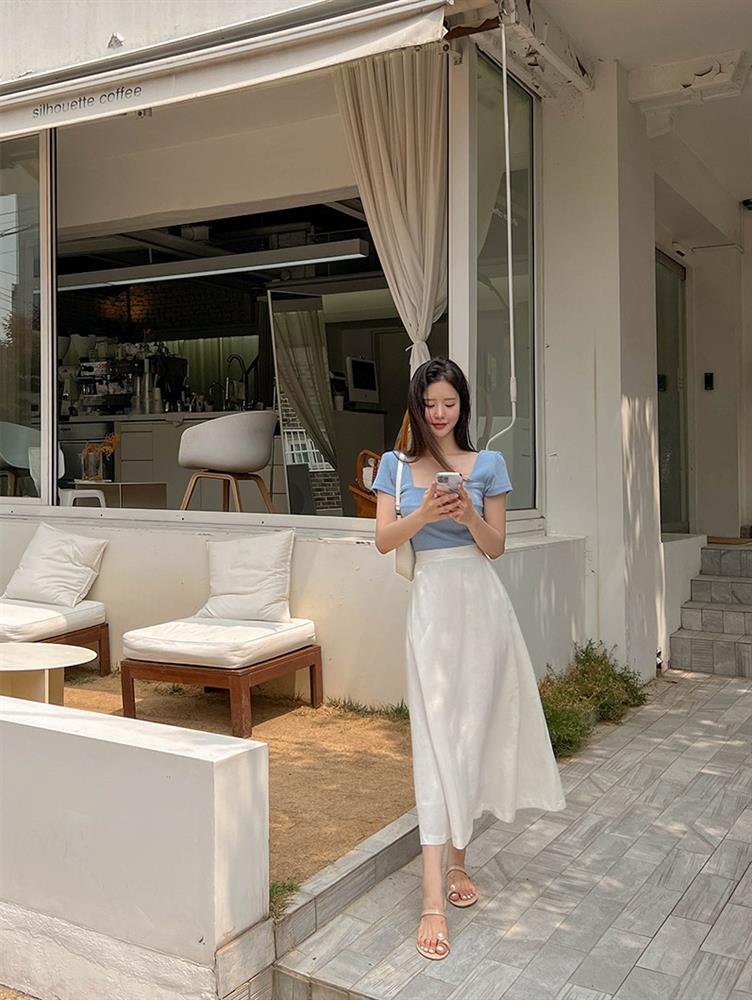 Chân váy màu xanh bạc hà mang đến cảm giác dịu mát. Vẻ ngoài của người mặc càng thêm trẻ trung, tươi mới nhờ kết hợp với áo blouse trắng. Ngoài khả năng hack tuổi tuyệt diệu, combo áo blouse trắng + chân váy xanh mint còn ghi điểm ở sự tinh tế, thanh lịch.