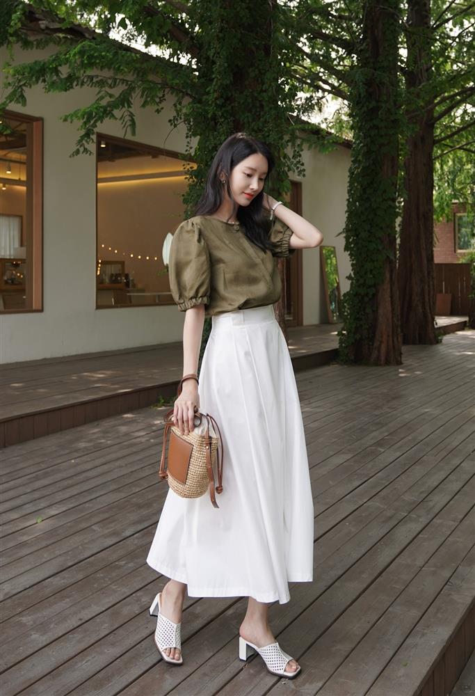 Combo áo blouse màu xanh rêu + chân váy trắng ghi điểm ở sự trang nhã. Thiết kế chân váy bồng xòe mang đến nét bay bổng cho người mặc. Khi diện chân váy dài, chị em nhất định nên sơ vin để hack chiều cao nhé!