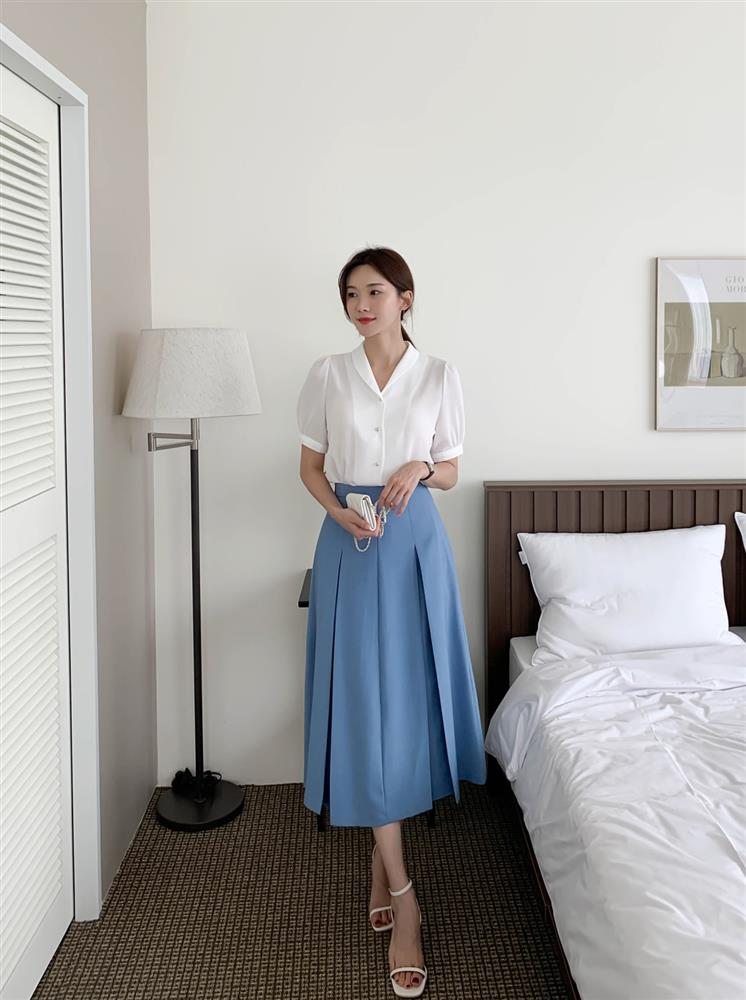 Mẫu áo blouse tay bồng đem đến nét yêu kiều cho người mặc. Chân váy màu xanh pastel quả là mảnh ghép hoàn hảo đối với mẫu áo, vừa hack tuổi tốt, vừa đảm bảo sự thanh lịch. Chị em đừng quên là ngoài giày búp bê, giày cao gót, sandal quai mảnh cũng rất hợp để diện với chân váy dài, và không làm ảnh hưởng đến nét tinh tế của outfit công sở.