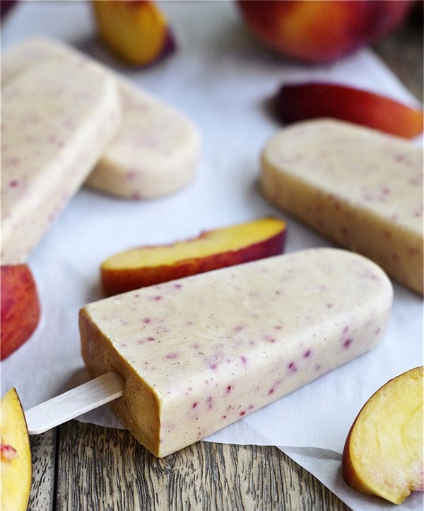 Một cây kem từ hỗn hợp đào và chuối này chỉ chứa 68 calo mà thôi. Tha hồ giải nhiệt mà không lo béo nhé!