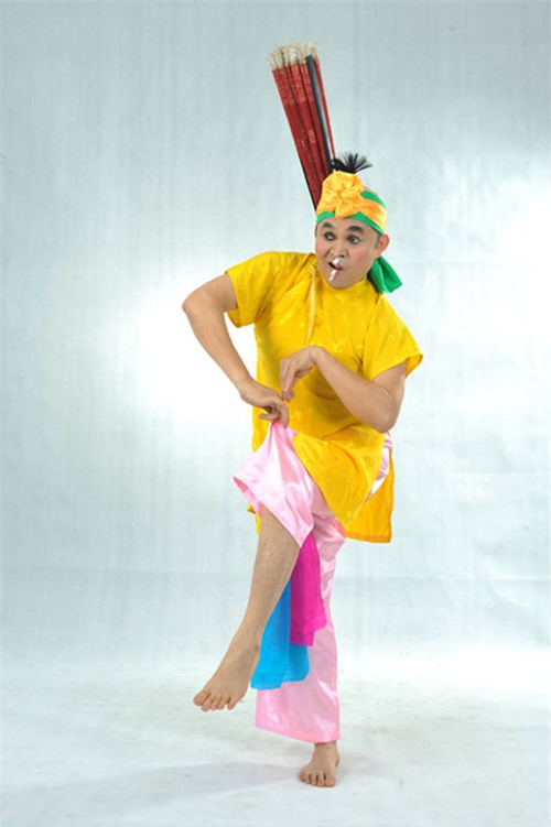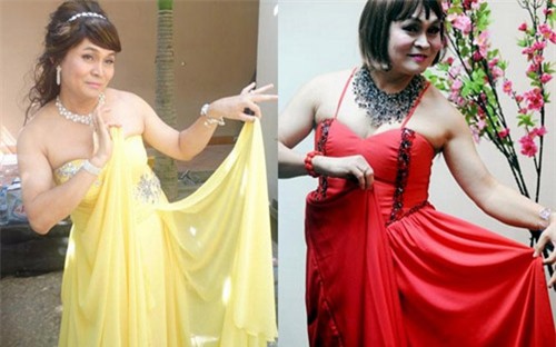 Danh hài trong hai bộ váy vàng – đỏ để phục vụ cho các vai diễn. Dù không sở hữu “thân hình chuẩn” nhưng điều đó không làm Xuân Hinh e dè với những tạo hình cần phải giả gái cùng những bộ trang phục có phần khoe da thịt.