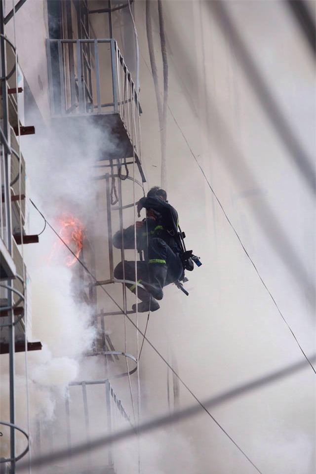 Khi đó, lực lượng chức năng đã đưa một người mắc kẹt trên nóc tòa nhà 9 tầng xuống đất an toàn.