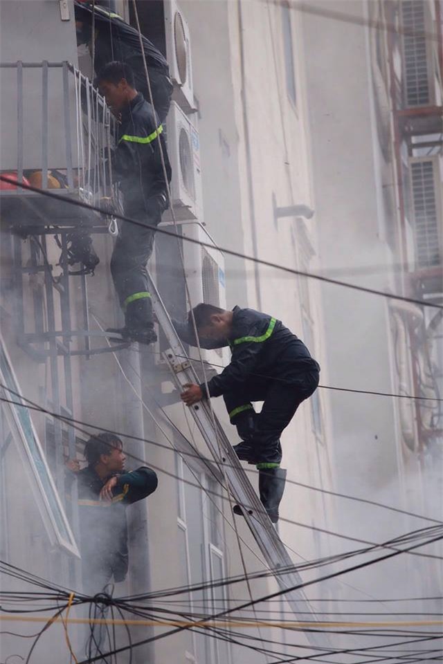 Song song với mũi triển khai qua cầu thang bộ và tổ chức chữa cháy từ tầng 2 đến tầng 3, Cảnh sát PCCC triển khai 1 đội hình chữa cháy qua cầu thang thoát nạn ngoài nhà, 2 đội qua tầng tum công trình bên cạnh nhà số 68; 1 cầu dây tiếp cận xuống vị trí tầng 5 để trinh sát, tìm kiếm người bị nạn và phá dỡ các cấu kiện để thoát khói, tạo điều kiện cho công tác chữa cháy, cứu nạn, cứu hộ.