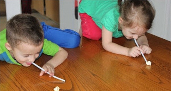 bỏng ngô và kiếm vài cái ống hút, nhiệm vụ của các con là di chuyển hạt