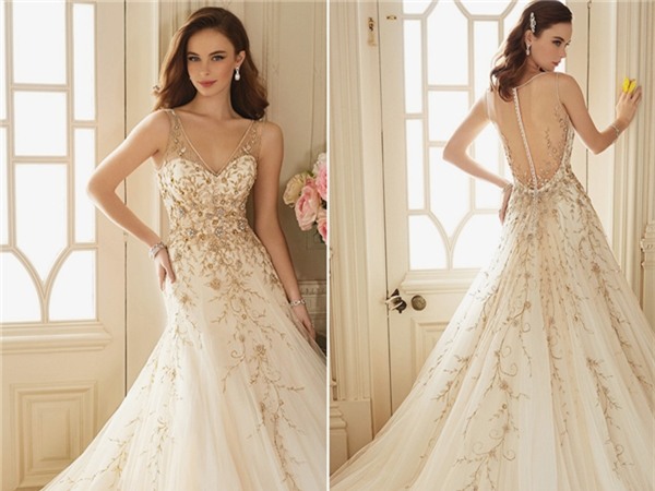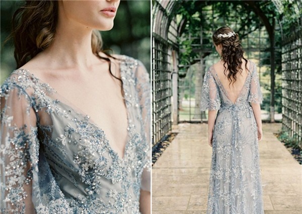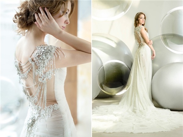 Thiết kế táo bạo này được tạo ra bởi hãng Galia Lahav. Những cô nàng cá tính, theo đuổi phong cách quyến rũ, gợi cảm hoàn toàn có thể chọn thiết kế này. Sự cầu kì, sang trọng được thể hiện nổi bật qua đa dạng loại hạt và cườm đính trên váy áo. (Ảnh:Internet)