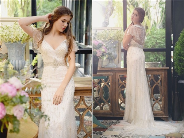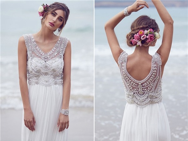 Điểm nhất "đắt giá" nhất trong thiết kế của Anna Campbell là những hạt cườm chạy dọc thân áo thay cho những đoạn đăng ten thông thường. Vừa kín đáo lại vừa sang trọng là tinh thần của chiếc váy cưới "trên cả tuyệt vời" này. (Ảnh:Internet)