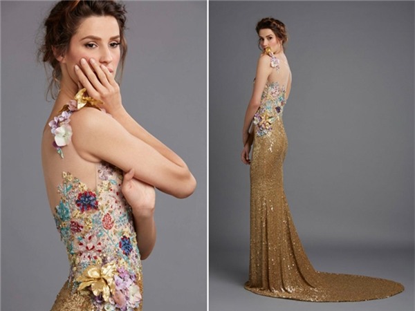 Khác với các hãng thiết kế khác, Hamda Al Fahim lựa chọn tông màu vàng ánh kim cho thiết kế của mình. Một rừng hoa bốn mùa được điểm xuyến quanh thân áo là điểm sáng nổi bật của chiếc váy cưới này. (Ảnh:Internet)