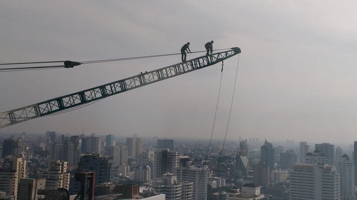 Bức ảnh được chụp ở độ cao tương đương với tầng thứ 33 của một tòa nhà và 2 người đàn ông trong ảnh không sử dụng bất kì thiết bị bảo hộ lao động nào cả. (Ảnh: brightside)