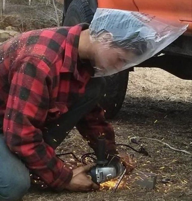 Không có kính để bảo vệ mắt nên người đàn ông này phải dùng chai thủy tinh thay thế. Mong rằng chiếc chai này có ích như anh ấy suy nghĩ. (Ảnh: brightside)