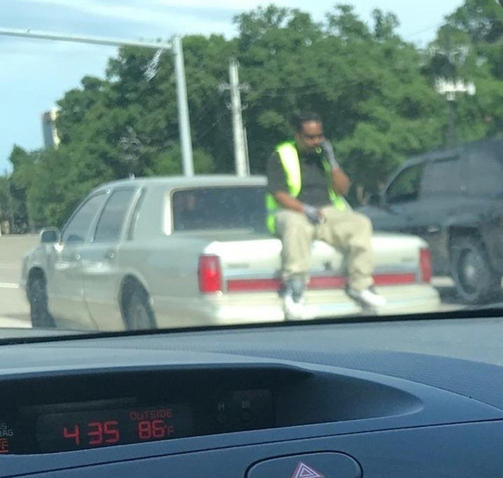 Chẳng lẽ trong xe hết chỗ ngồi hay sao mà người đàn ông này phải ra ngoài ngồi thế nhỉ? (Ảnh: brightside)