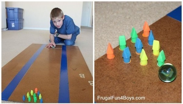 13. Chỉ cần những viên tẩy bút chì và một viên bi cũng giúp cậu bé này say mê với trò bowling.