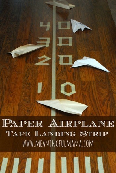 6. Hoặc cũng có thể sử dụng giấy dán xuống nền nhà để làm bãi đáp cho trò máy bay giấy của con.