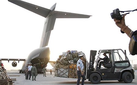 Lực lượng Ứng phó Thảm họa Quốc gia Ấn Độ (NDRF) đưa hàng cứu trợ lên máy bay để chuyển tới các nạn nhân động đất ở Nepal. Trận động đất ảnh hưởng tới nhiều quốc gia láng giềng của Nepal khiến 36 người Ấn Độ thiệt mạng. 12 người ở Tây Tạng, Trung Quốc và 4 người ở Bangladesh thiệt mạng. Ảnh: Getty |