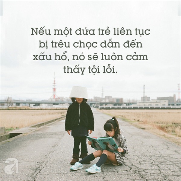6. Tương tự như chế giễu, mức độ nguy hiểm hơn của những lời trêu chọc từ phía người lớn với trẻ đó là khiến trẻ hình thành tâm lý mắc tội. Nếu một đứa trẻ liên tục bị trêu chọc dẫn đến xấu hổ, nó sẽ luôn cảm thấy tội lỗi. Vì vậy, bố mẹ nên thể hiện thái độ dứt khoát với những người hay có hành động trêu chọc con mình.