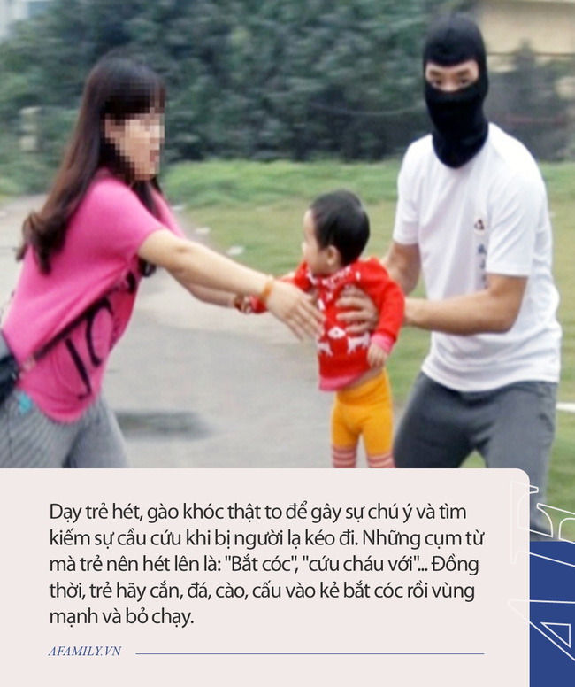 Dạy trẻ hét, gào khóc thật to để gây sự chú ý và tìm kiếm sự cầu cứu khi bị người lạ kéo đi. Những cụm từ mà trẻ nên hét lên là: "Bắt cóc", "cứu cháu với"... Đồng thời, trẻ hãy cắn, đá, cào, cấu vào kẻ đó rồi vùng mạnh và bỏ chạy.