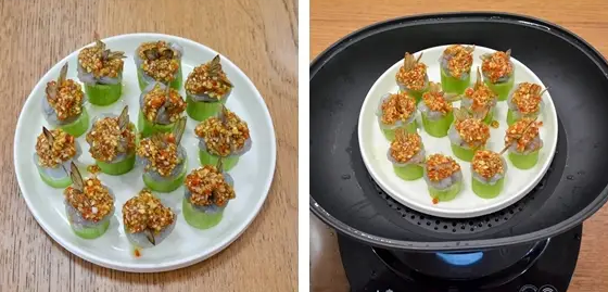 Sau đó xếp tôm đã chuẩn bị lên trên đậu phụ trứng. Tiếp đó, đặt đậu vào giữa con tôm, cho nước vào nồi hấp, đun sôi rồi đặt đĩa tôm vào, hấp trên lửa lớn trong 6 phút.