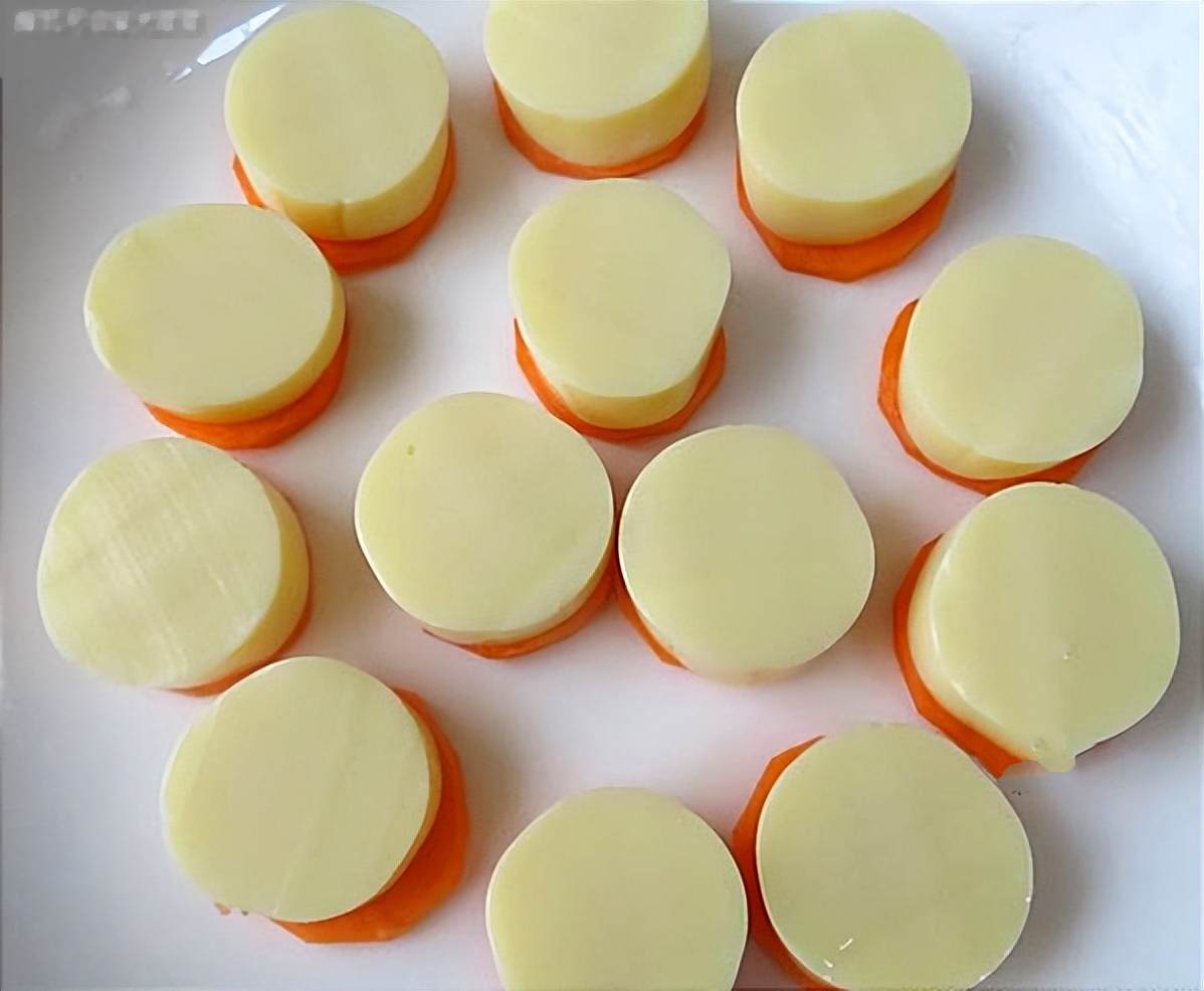Bước 3: Đầu tiên đặt những lát cà rốt đã chần dưới đáy đĩa, cắt miếng đậu phụ trứng thành những khoanh tròn nhỏ rồi đặt lên trên cà rốt.