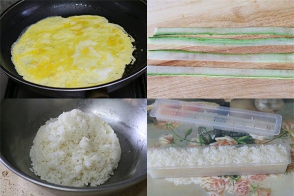 Đầu tiên, bạn đập trứng vào chén đánh tan cùng với một chút muối. Làm nóng chảo dầu trên bếp, đổ trứng vào chảo trán lớp mỏng. Dưa leo rửa sạch, cắt lát mỏng dọc theo chiều dài bổ đôi lát dưa thành hai nửa. Cơm chín cho vào bát trộn với muối và dầu mè vừa ăn. Tiếp theo, bạn cho cơm vào khuôn sushi nén chặt thành các thanh cơm dài.