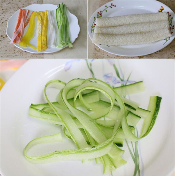 Bạn cắt thanh cua thành những thanh dài, tách riêng phần bên ngoài màu hồng và bên trong màu trắng. Cắt 2 thanh củ cải vàng thành thanh dài. Cắt trứng chiên thành những thanh dài. Lưu ý chiều dài của thanh cua, củ cải, trắng, dưa leo bằng nhau. Dưa leo sau khi cắt thanh dài, bạn ngâm trong nước muối 5 phút cho mềm để dễ tạo hình.