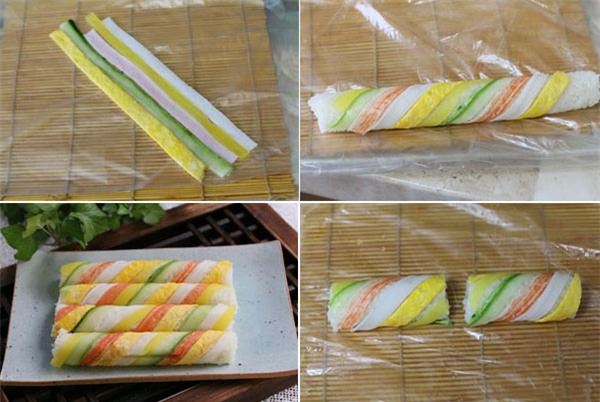 Đặt tấm mành tre bên dưới, tấm nilon bên trên bạn xếp lần lượt các thanh trứng, dưa leo, thanh cua hồng, củ cải, thanh cua trắng nằm chéo so với tấm mành tre. Tiếp đến, bạn đặt cuộn cơm lên trên và cuộn các thanh trứng, dưa leo, thanh cua, củ cải xoắn bao quanh bên ngoài cuộn cơm. Dùng dao cắt phần cơm trắng hai đầu. Tương tự, bạn cuộn dưa leo, trứng, thanh cua, củ cải cho các cuộn cơm còn lại. Cắt đôi cuộn cơm.