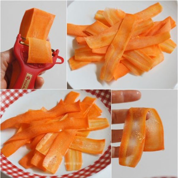 Cà rốt gọt vỏ, rửa sạch, dùng dao bào thành những lát mỏng theo chiều dài. Cho hỗn hợp 2 muỗng canh giấm, 1 muỗng canh đường, ½ muỗng canh muối vào bát trộn đều. Tiếp theo, bạn cho cà rốt bào lát mỏng vào bát nước ngâm 20 phút để các lát cà rốt mềm dễ cuốn.