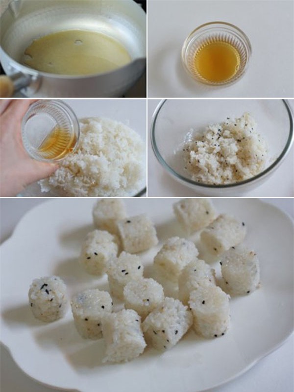 Bạn cho 1 muỗng canh giấm, 2 muỗng canh đường, một chút muối vào nôi đun sôi làm gia vị trộn cơm. Đổ hỗn hợp gia vị vào bát cơm trộn đều cùng với mè đen. Tiếp đến, cho cơm vào khuôn làm sushi nén chặt thành thanh dài rồi cắt khúc.