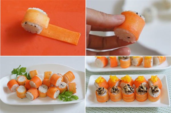 Tiếp theo, bạn cuộn viên cơm tròn bên trong miếng cà rốt. Tương tự, bạn cuộn cơm trong những miếng cà rốt còn lại. Cuối cùng, bạn múc ít nấm xào, ớt chuông vàng băm nhỏ đặt lên trên mỗi cuộn cơm là xong.