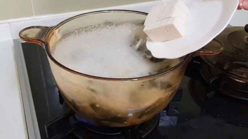 Cho 1- 1,5 lít nước sạch vào nồi đun sôi lên. Khi nước đã sôi, bạn cho chỗ rong biển với tôm đã xào ở bát vào. Khi canh sôi trở lại thì cho đậu phụ vào cùng, đun sôi khoảng 3-5 phút rồi tắt bếp.