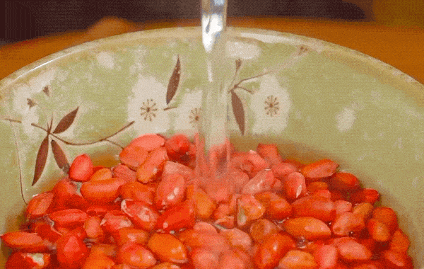 Bước 1: Bạn cho đậu phộng vào âu, đổ nước vào ngâm trong khoảng 1 giờ cho đến khi vỏ mềm. Sau đó chà nhẹ nhàng để loại bỏ lớp vỏ bên ngoài của đậu phộng. Hoặc bạn có thể đổ nước nóng vào đậu phộng rồi đun trong khoảng 3 phút. Đợi nước nguội đi thì lột bỏ lớp vỏ.