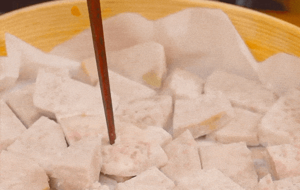 Bước 3: Trong khi đậu phộng đang được nấu thì bạn sơ chế khoai môn. Gọt vỏ và rửa sạch nửa củ khoai môn. Sau đó bạn cắt khoai môn thành từng miếng nhỏ rồi hấp trong khoảng 20 phút - khi dùng đũa có thể dễ dàng xiên và làm vỡ miếng khoai.