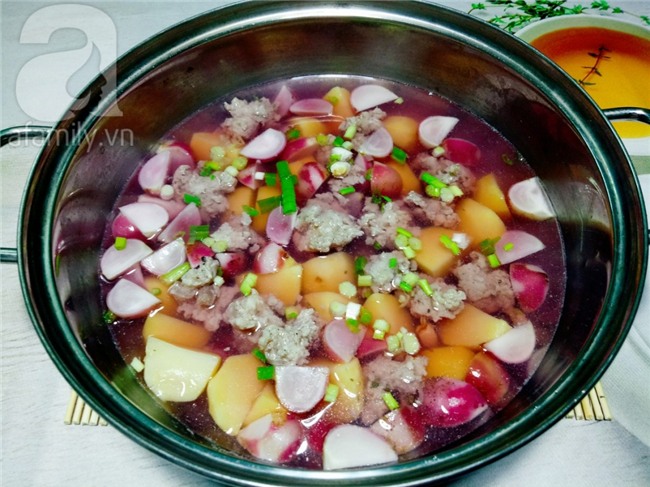 Múc canh ra tô dùng nóng rất ngon, tô canh có màu hồng nhạt đẹp mắt. Vị khoai tây thơm bùi, vị củ cải giòn ngọt với từng viên thịt heo béo mềm quyện cùng nước canh thanh ngọt, đưa cơm vô cùng.