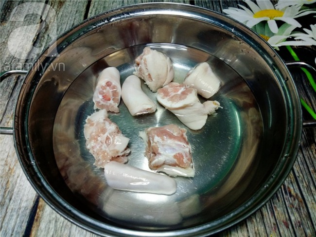 Đuôi heo rửa sạch, chặt khúc nhỏ rồi ngâm với nước muối khoảng 10 phút. Cho vào nồi cùng với nước lạnh và tí muối rồi đặt lên bếp nấu. Khi nồi nước bắt đầu sôi thì vớt đuôi heo ra, đổ bỏ nước (đây là bước loại bỏ mùi và chất bẩn nếu có).