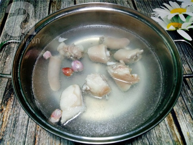 Cho đuôi heo lại vào nồi rồi cho lượng nước vừa đủ ăn vào nấu. Cho gia vị muối, bột nêm và hành củ tím đập dập vào nấu cùng đuôi heo cho đến khi đuôi heo chín mềm.