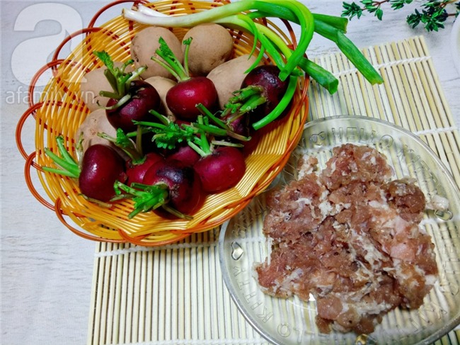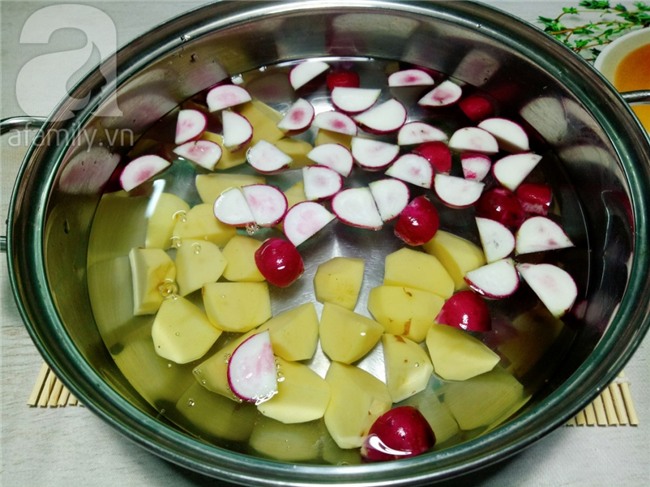 Cho khoai tây và củ cải đỏ vào nồi với một lượng nước vừa đủ dùng (khoảng 1 lít nước) cùng với muối, tí đường phèn rồi nấu trên lửa vừa.