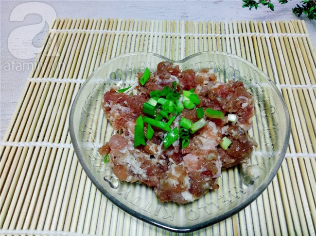 Thịt heo xay ướp với gia vị muối, bột nêm, tiêu, hành tím băm nhuyễn và chút hành lá để trong 20 phút cho thịt heo ngấm gia vị.