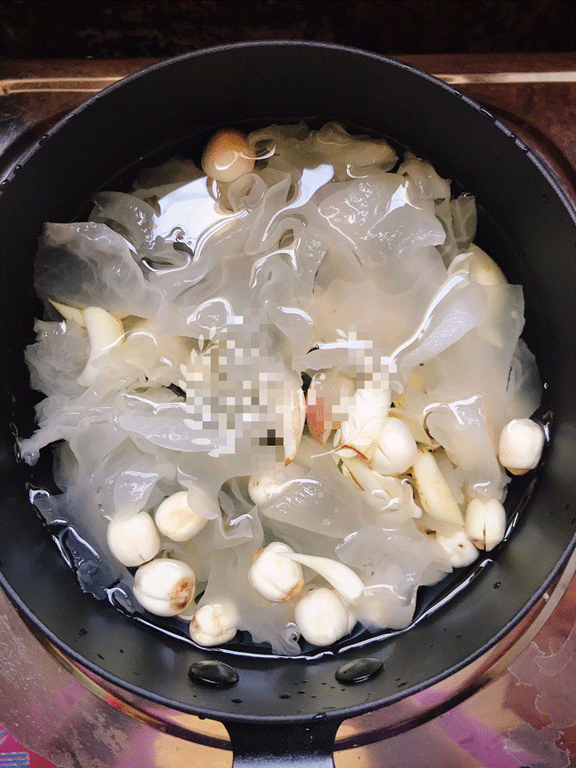 Bước 1: Hạt sen và nấm tuyết ngâm khoảng 1 tiếng trước khi nấu. Sau đó xé nấm tuyết thành từng miếng nhỏ. Cho hạt sen, hoa huệ và mộc nhĩ vào nồi, thêm khoảng 1 lít nước. Đu đủ bạn gọt vỏ, sau đó thái miếng vừa ăn.