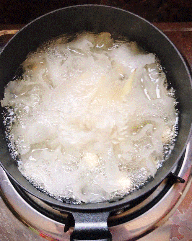 Bước 3: Sau khi nấu được 20 phút thì bạn thêm đường phèn rồi nấu 5 phút nữa. Tắt bếp khi đường phèn đã tan hoàn toàn.