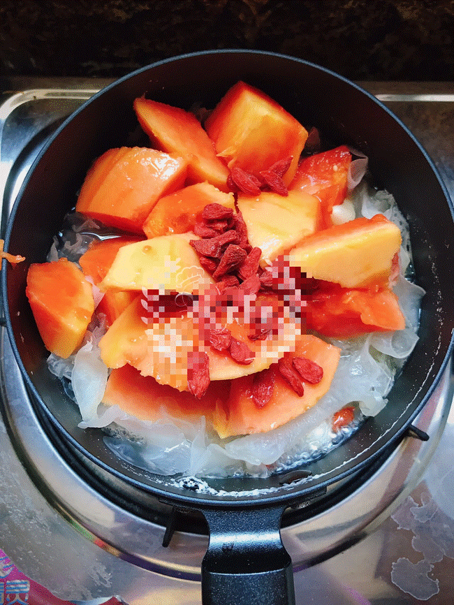 Bước 2: Đun sôi rồi điều chỉnh về mức lửa vừa rồi hạ xuống đun nhỏ lửa trong 30 phút. Thêm đu đủ và kỷ tử vào rồi tiếp tục đun ở mức lửa nhỏ trong 25 phút.