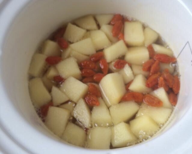 Bước 2: Cho khoảng 2 bát nước lọc vào nồi (hoặc nồi chưng yến), đun sôi, cho táo vào đun ở mức lừa nhỏ trong khoảng 20 phút. Cho kỷ tử vào và tiếp tục đun thêm khoảng 10 phút thì tắt bếp.