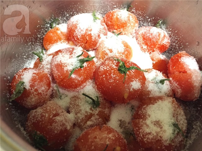 Cho đường vào rắc đều lên khắp lượt cà chua, không dùng đũa chỉ cần lắc nhẹ để đường bám hết vào cà chua.