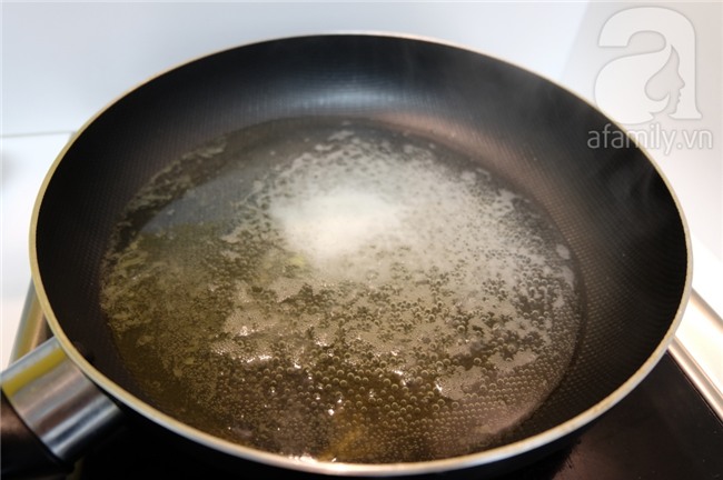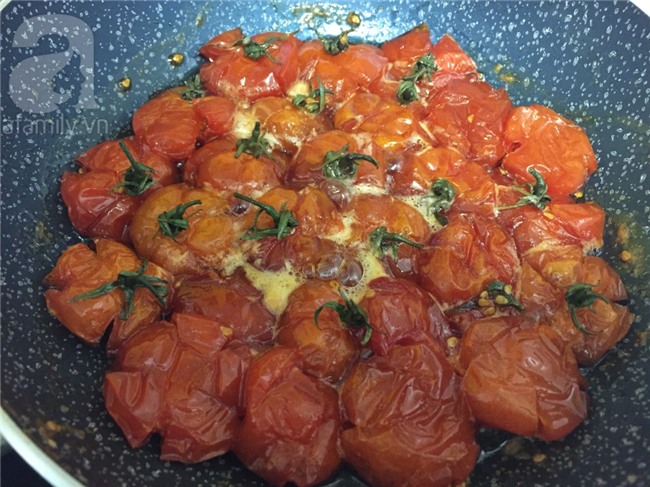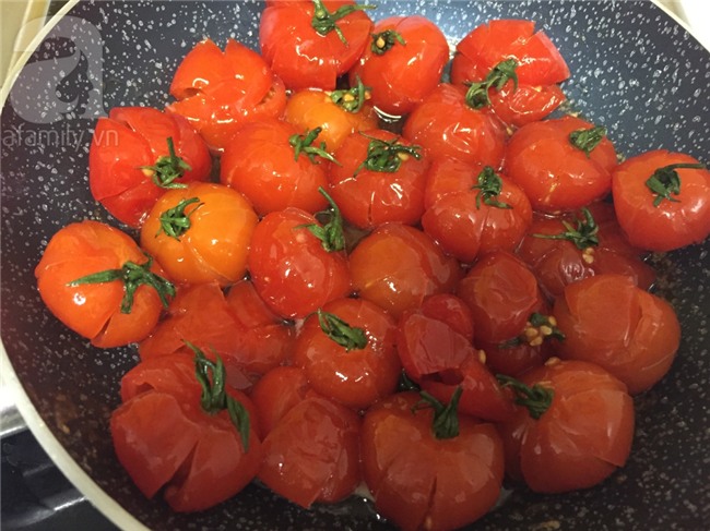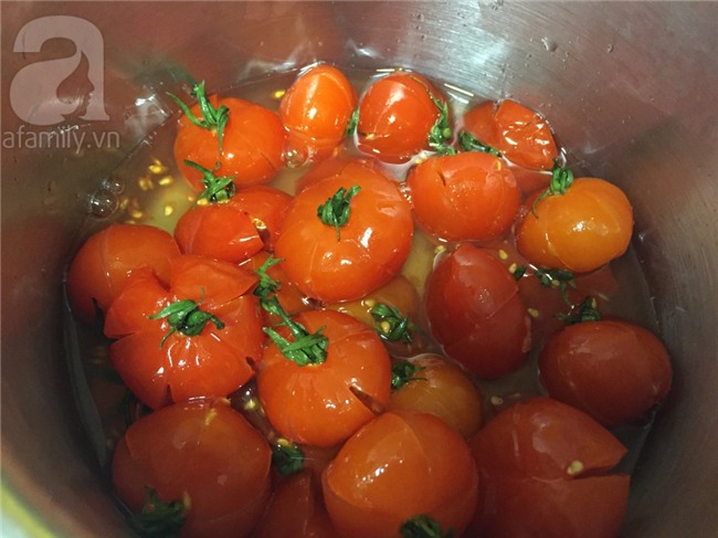 Đổ phần nước đường tan ra vào chảo, đun nhỏ lửa cho sánh lại thì thả cà chua vào, đun lửa nhỏ liu riu.