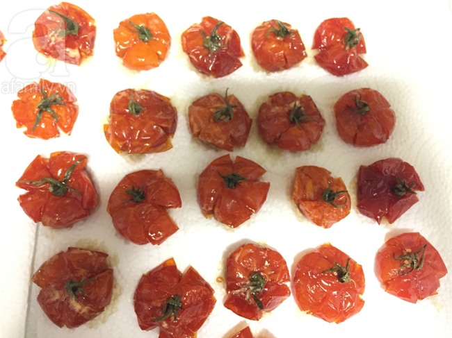 Xếp cà chua lên rãnh, hoặc giấy ăn mang phơi trong phòng có điều hòa hoặc ngoài nắng cho khô chừng 14 tiếng. Sau đó bảo quản trong hũ kín.