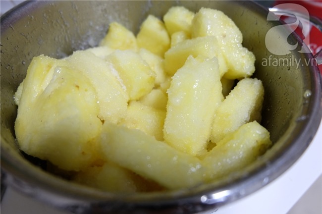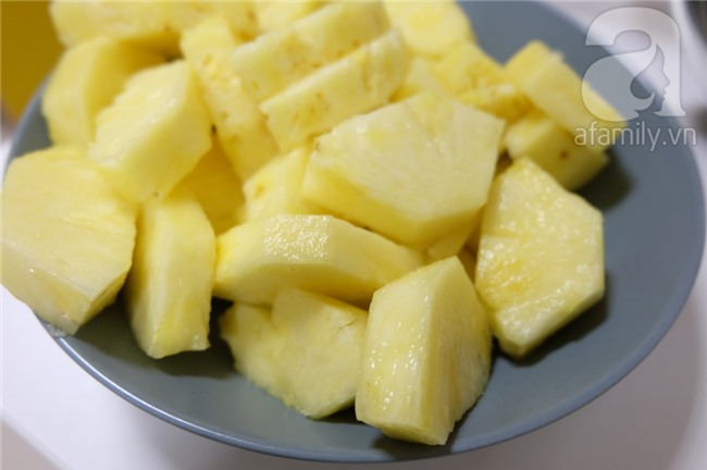 Đổ dứa vào nồi hoặc âu to, cho đường vào, xóc đều lên để đường bám đều vào miếng dứa. Đậy vung lại ngâm qua đêm khoảng 8h.