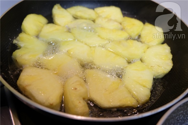 Lưu ý không lật dứa mà cứ để nguyên miếng dứa như vậy kẻo bị nát. Sau khi sên dứa được 1h bạn tắt bếp, để nguyên dứa trong chảo nước đường. Quá trình này giúp phần dứa sẽ trong ra.