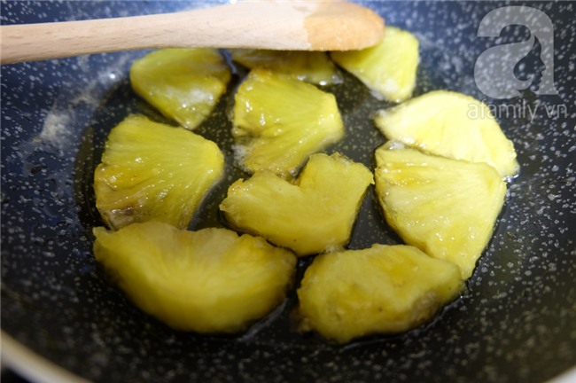 Sau thời gian ngâm trên, trút phần nước dứa ngâm vào chảo, đun cho hỗn hợp nước sánh lại.