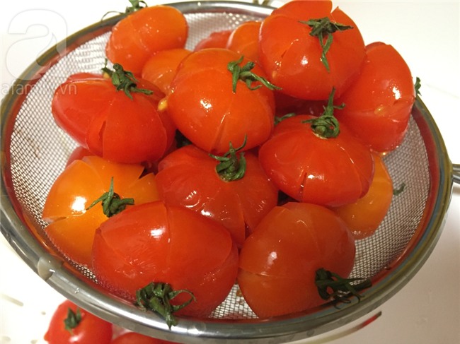 Cà chua rửa sạch, cẩn thận không để rụng núm cà chua. Với cà chua quả tròn thì khía cà chua thành múi, còn nếu cà chua bi bé thì lấy tăm nhọn châm nhẹ vào khắp quả cả chua. Bóp nhẹ để phần hạt và nước bên trong ra bớt.