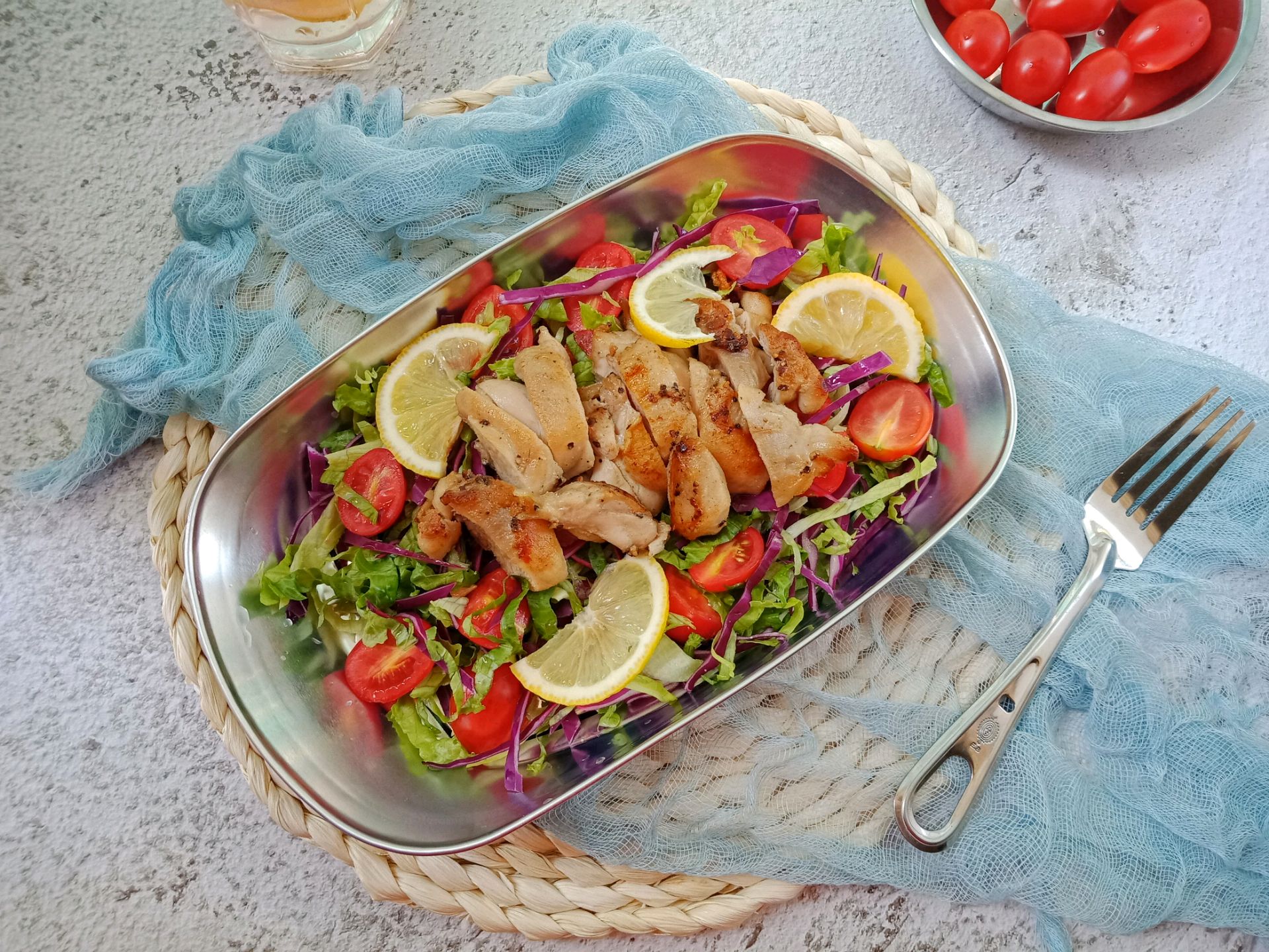 Bước 4: Cho bắp cải, xà lách xoăn, cà chua bi, thịt gà đã chiên và vài lát chanh vào bát. Vắt nước cốt chanh lên trên rồi thêm sốt mayonnaise vào trộn đều là hoàn thành.