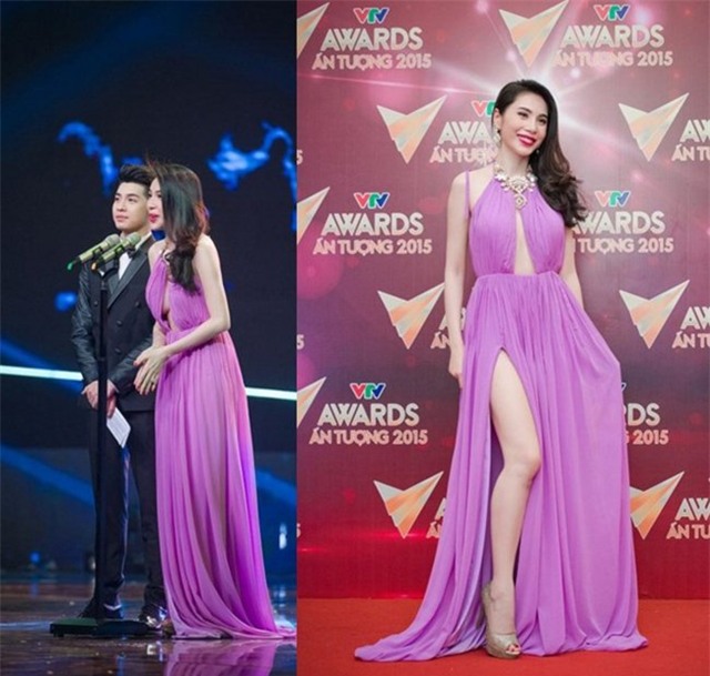 Nữ ca sĩ xuất hiện trên thảm đỏ giải thưởng Ấn tượng VTV Awards 2015 cùng đàn em trong chiếc đầm dạ hội màu tím được cắt xẻ táo bạo, khoe chân dài nuột nà cũng như vòng mọt đầy đặn, gợi cảm.