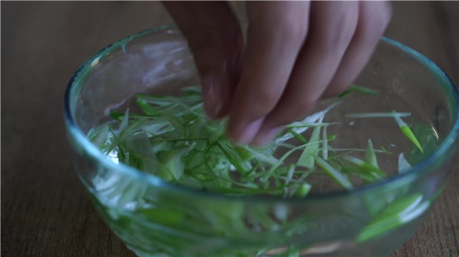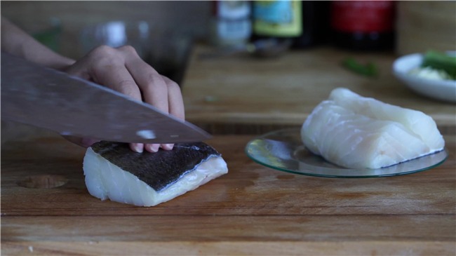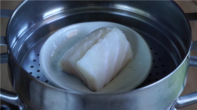 Trong thời gian hấp cá, xắt gừng thành sợi nhỏ, chừa lại 2 lát nhỏ để bên dưới đĩa trước khi đặt khúc cá lên để cá có mùi thơm. Hành lá thái từng khúc, rồi ngâm qua nước lạnh.
