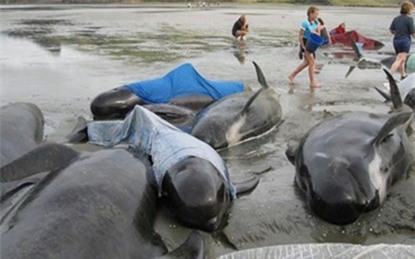 Gần 200 con cá voi hoa tiêu bị mắc cạn, nằm la liệt trên một bãi biển ở New Zealand - nơi có tiếng là "tử địa" của nhiều loài động vật biển.